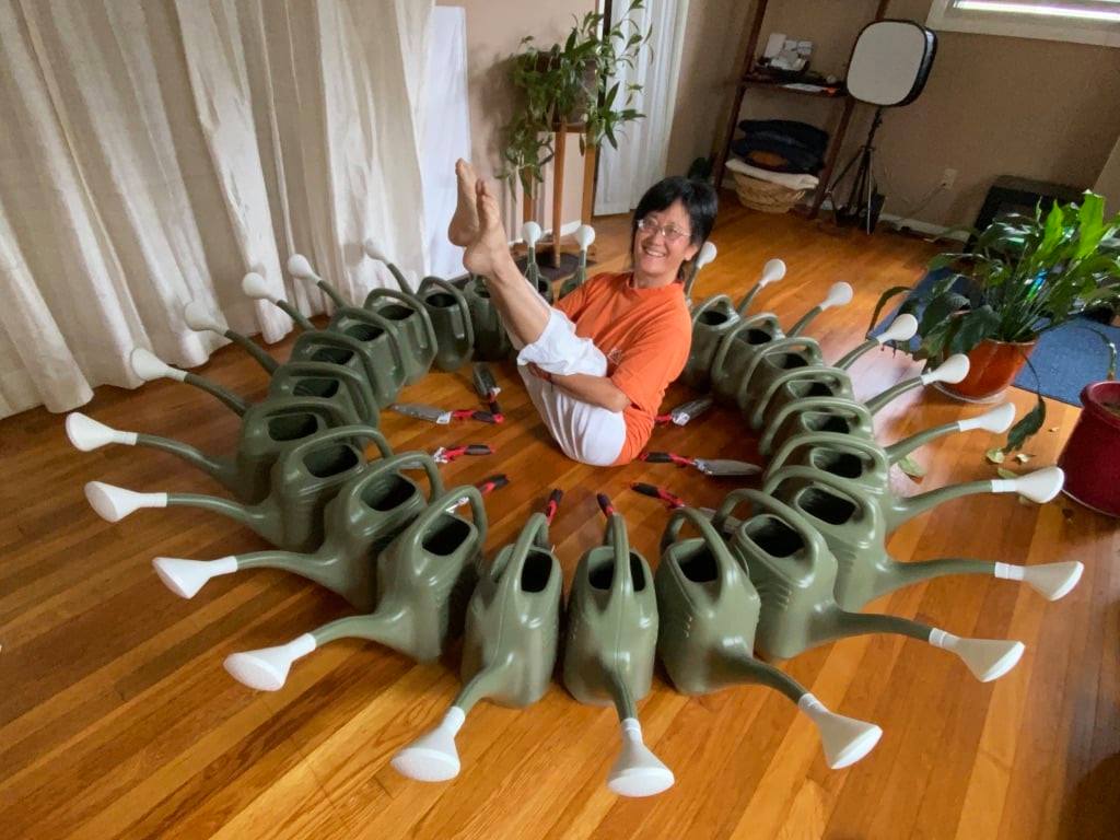 Dianne Kadonaga: I never had intentions of doing so initially, nor did I know how, but it all started when I was addressing some of my own health issues – diabetic indicators, high cholesterol and blood pressure, precancerous polyps. I was eating more fresh, organic food, but it was expensive and often beyond my budget. It seemed like it would be cheaper to grow and eliminate the unrecyclable plastic packaging it came in too if I grew it instead. With the huge 175 year old pin oak in the backyard and silver maple shading the front, there was not enough sunlight to grow an annual vegetable garden, so added in bare root perennial edible plants that would create a forest edge from the pin oak as the highest canopy, chestnut, hazelnuts, elderberry and apple as the subcanopy, red and black raspberry, gooseberries and currants as the shrub layers, down to strawberries as ground cover, as well as perennial asparagus, sea kale, and artichoke and herbs. With increasing rain, I added in subtropical annual plants like ginger, turmeric, for my health, and taro and sweet potato fit well into the dappled shade of the forest garden. Not having a lot of money to spend, my methods had to be little or no cost and with minimal input as I put in swales to reduce the flooding in my yard and direct it along the garden beds. Leaves from my trees and kitchen compost provided free fertilizer and ground cover, all reducing the need to water the garden all year round. Rain off the tool shed kept the shiitake and blue oyster mushrooms growing. I didn’t realize until many years later, that I was using permaculture / regenerative agricultural methods.