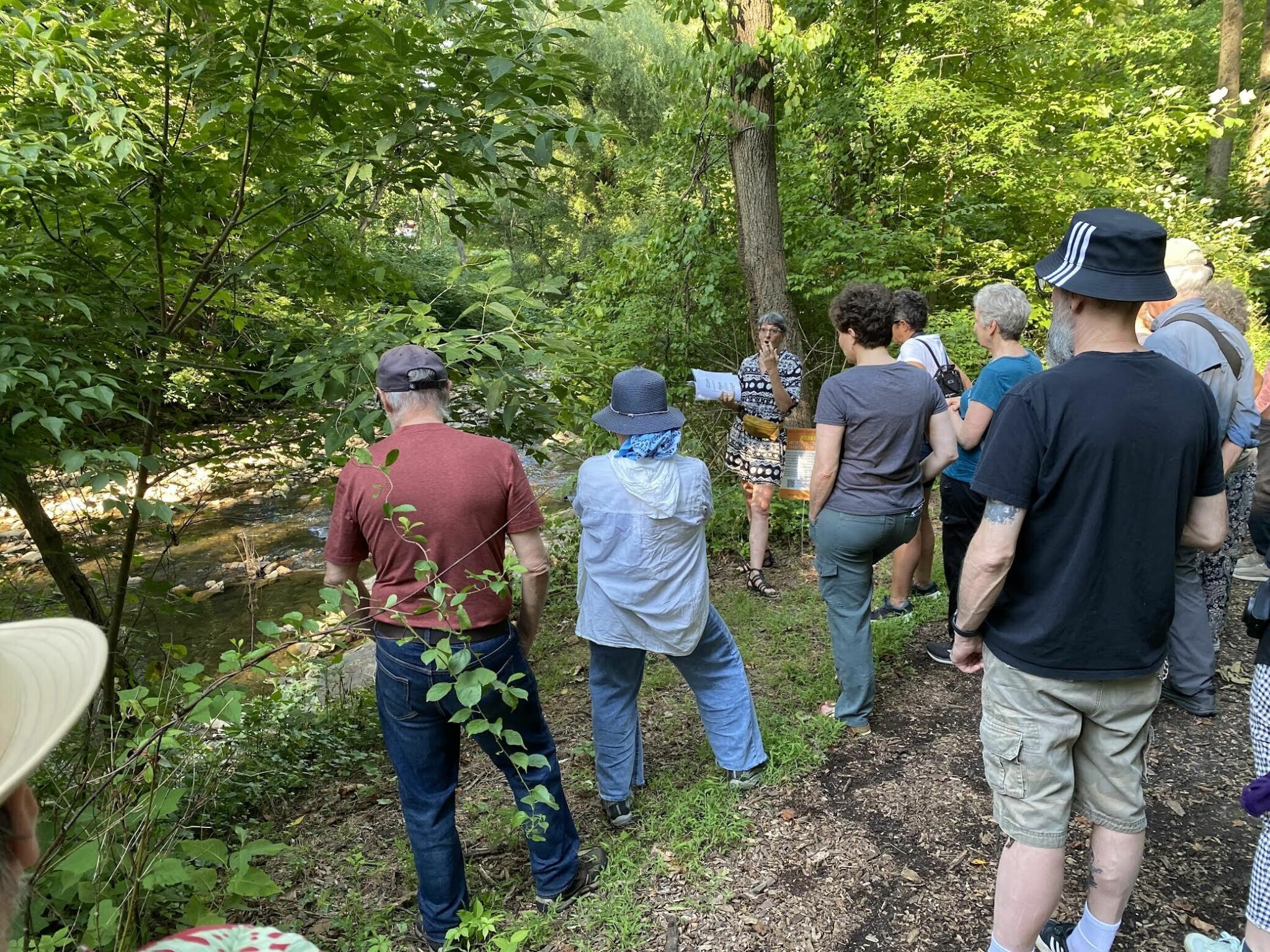 Photo caption: Rebecca Schultz delivering her Artist Walk and Talk to attendees at High School Park, for the opening of the A World in Our Streams installation