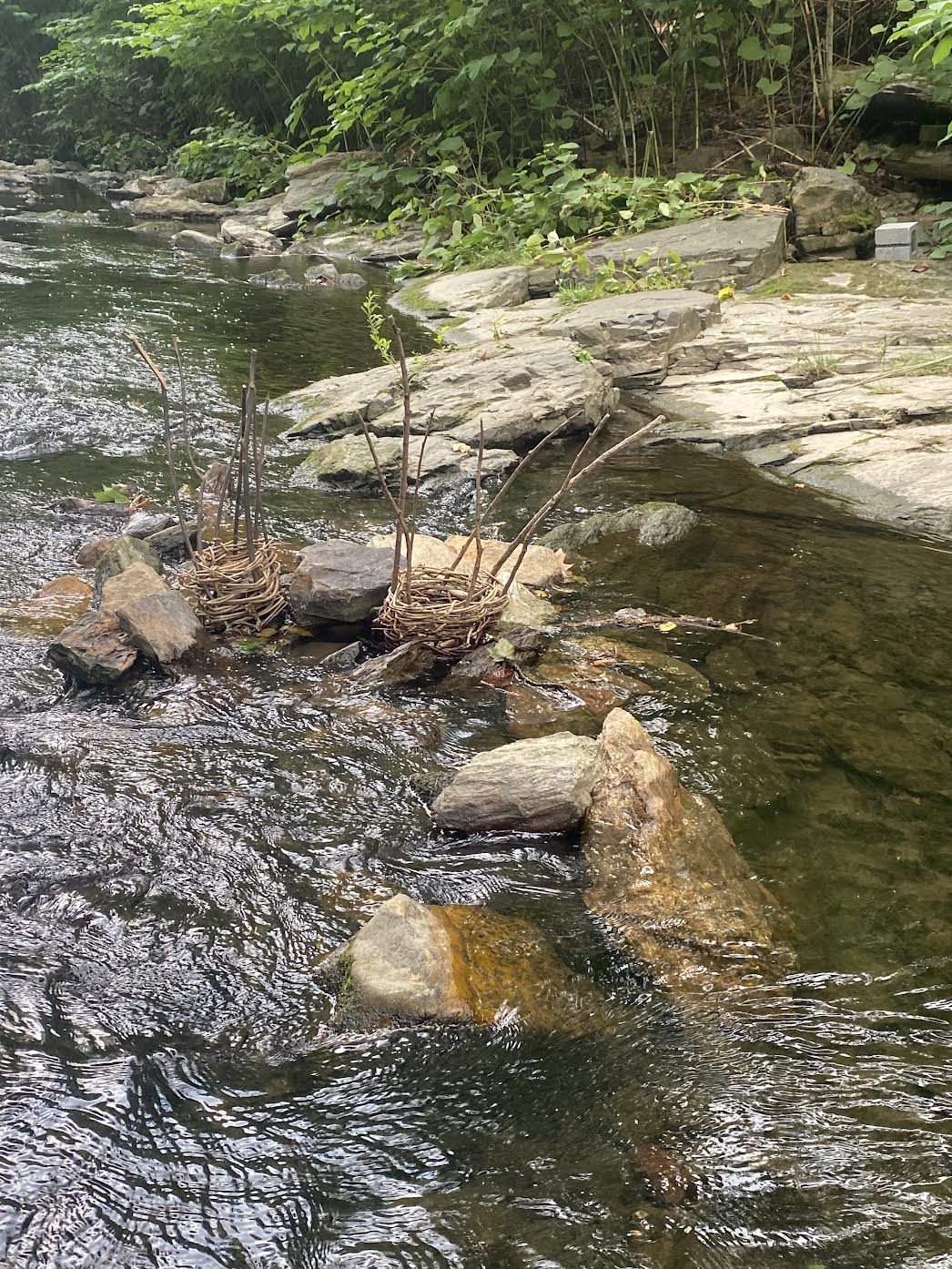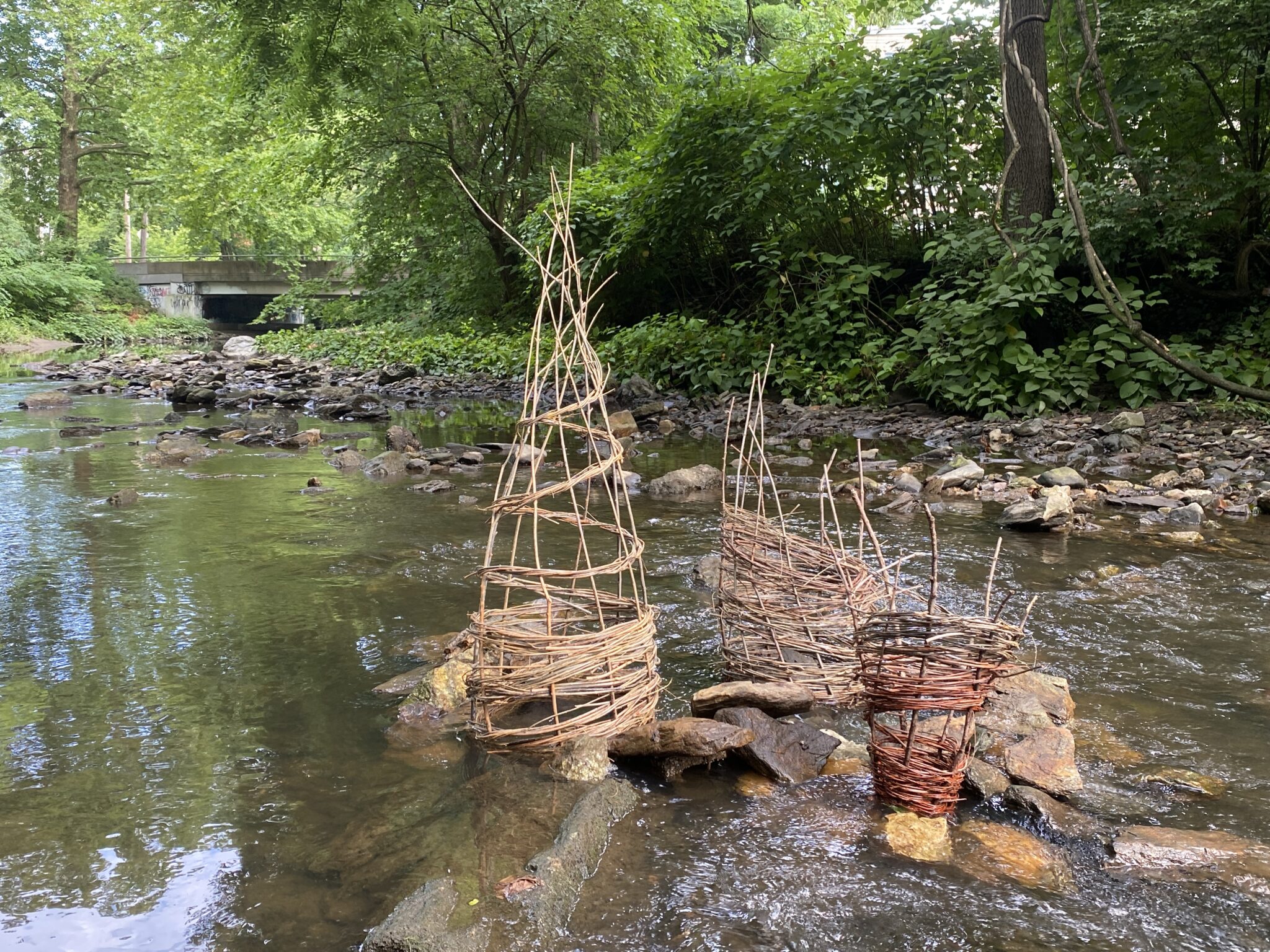 RS: This project has been a lesson in resilience and flexibility. I installed three sculptures woven from willow branches, inspired by the forms of indigenous fish traps, in Tookany Creek the day before my artist talk. I also put two sculptures inspired by Hester Dendy macroinvertebrate samplers into the stream, tied to cinder blocks. That night, there was a storm where we had nearly an inch of rain in an hour and 35 mph wind gusts. I came back the next morning, and the woven sculptures were almost completely destroyed. One of the Hester Dendys was nowhere to be found. Water is extremely powerful. I quickly rebuilt two woven forms, that are shorter and more densely woven than the first set, and installed them in the creek. It’s now been more than two weeks, and they’re doing okay. They’re actually collecting leaves and other natural debris, which is a good thing. They’re evolving in collaboration with the creek. On August 24th, I will co-facilitate a workshop with my friend and collaborator Ryan Neuman from TTF, where we will sample macroinvertebrates from the sculptures and see what we find!