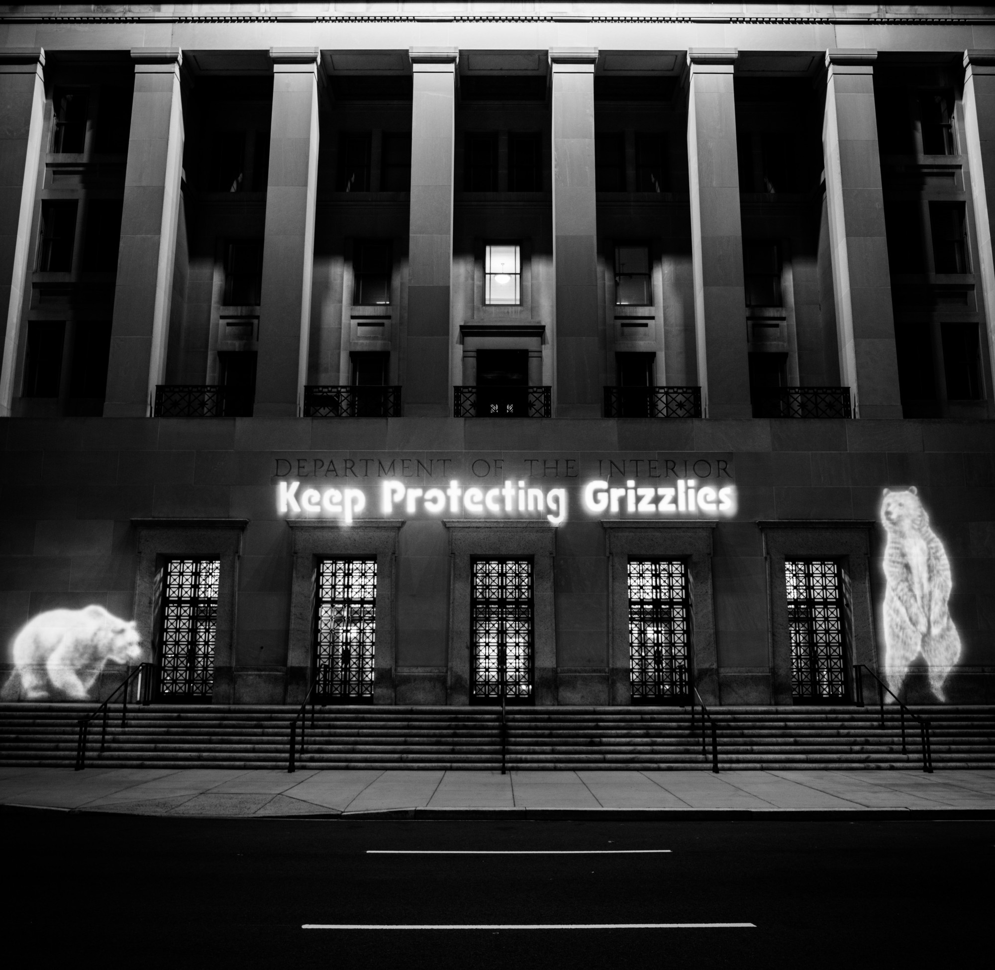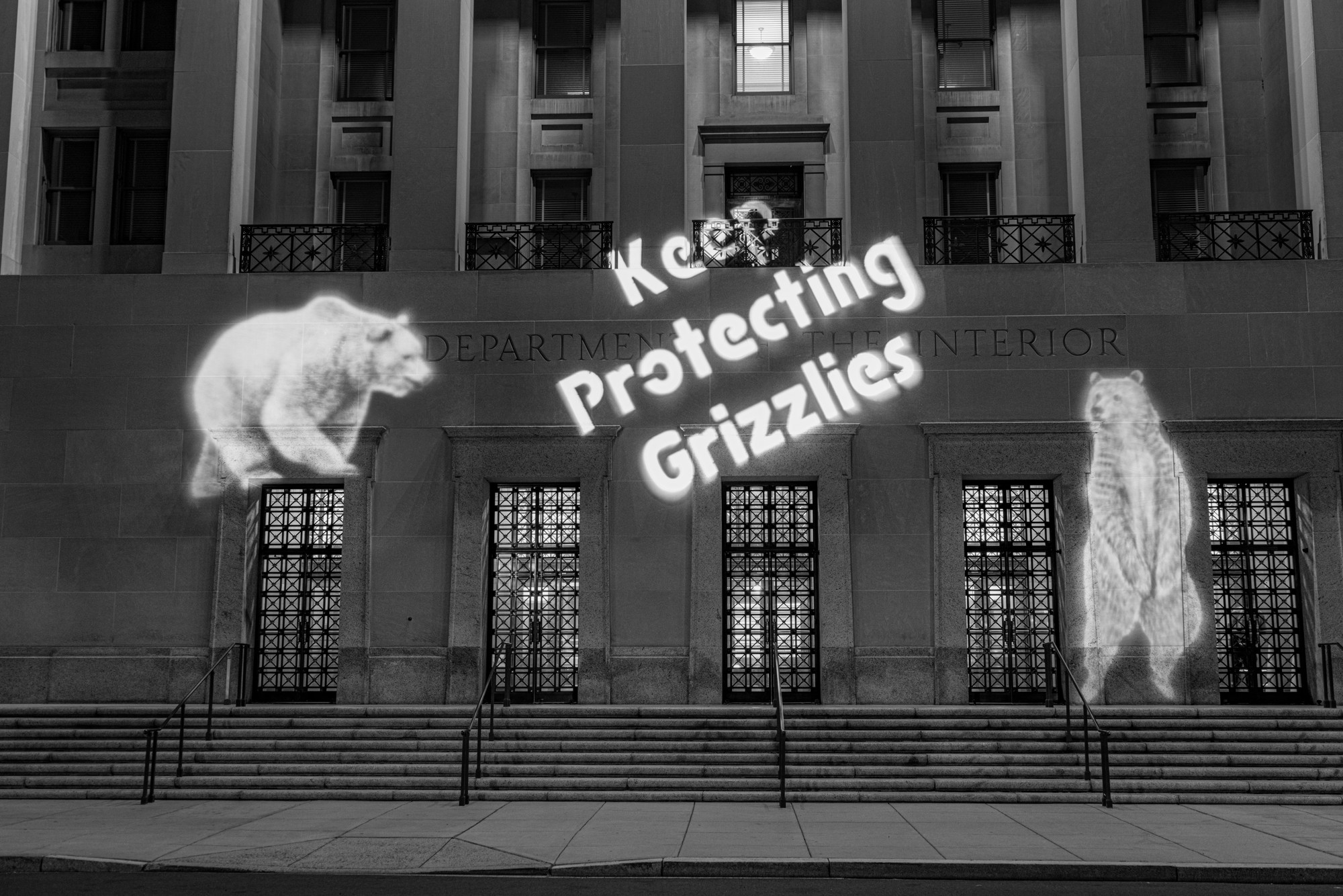 On Monday evening near dusk, grizzly bear images were projected onto the Department of Interior building, along with large lettering urging the Department to keep grizzly bears protected.