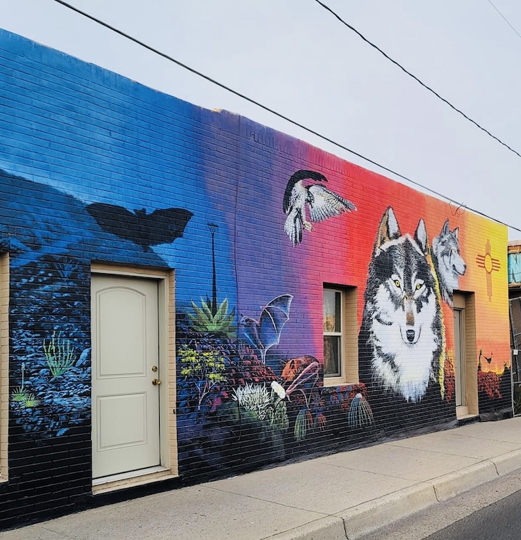 Migration: A Natural Act is a striking portrayal of the natural magnificence of southwestern New Mexico, with a particular focus on its imperiled fauna. The mural highlights the Boreal Owl, Gila Monster, and two endangered fish species – the Chihuahua Chub and Roundtail Chub. Migration is a recurring theme of the artwork, with the river symbolizing the innate movement of humans and animals across the landscape. Read more here.