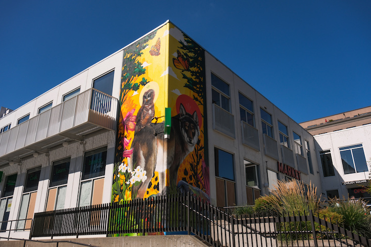 The 600 sq ft. masterpiece titled Nature’s Kaleidoscope, depicts an ecosystem of imperiled species and was painted over 14 days by talented local artist Jeremy Nicols. The mural features a gray wolf, a northern spotted owl, coho salmon, western-painted turtles, and as well as an array of pollinators and native plants. Read more here.