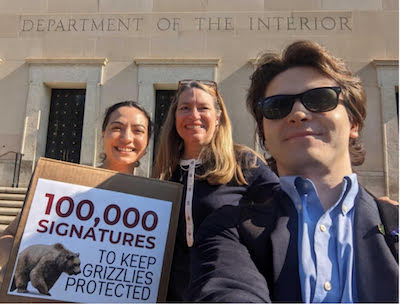 This year, national Bear Awareness Week fell in mid-May, and we decided to use that opportunity to raise awareness about grizzly bears, in a most unique way. ESC worked with the Backbone Campaign and a few of our conservation partners to project the image of a grizzly bear onto the wall of the U.S. Department of Interior. The following day, our staff returned to Interior and delivered over 100,000 petition signatures Sec. Haaland and FWS Director Martha Williams, urging them to keep grizzly bears protected.